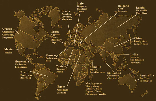 Par exemple, si l’on se réfère à la carte ci-dessous, une ambiance indienne sera amplifiée par les senteurs de jasmin, patchouli et bois de santal, tandis que l’eucaliptus et le gingembre accompagneront une déco plus asiatique…